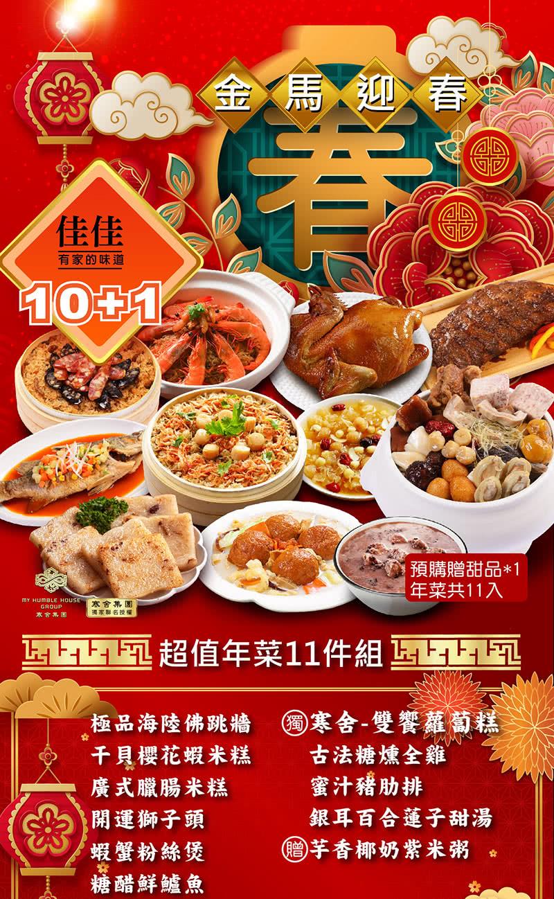 預購期間:早鳥限定優惠:1/31 前預訂外帶現做年菜套組,現省NT$1,000